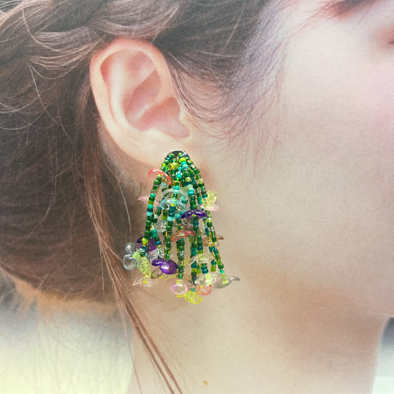 こちらのピアスは、繊細なビーズと花のモチーフが美しく組み合わさったデザインで、まるで小さな花園を耳元に飾るような気分を楽しめます。グリーンを基調に、鮮やかな色彩がアクセントとなり、見る角度によってきらめきを放つビーズが、軽やかで明るい印象を与えます。